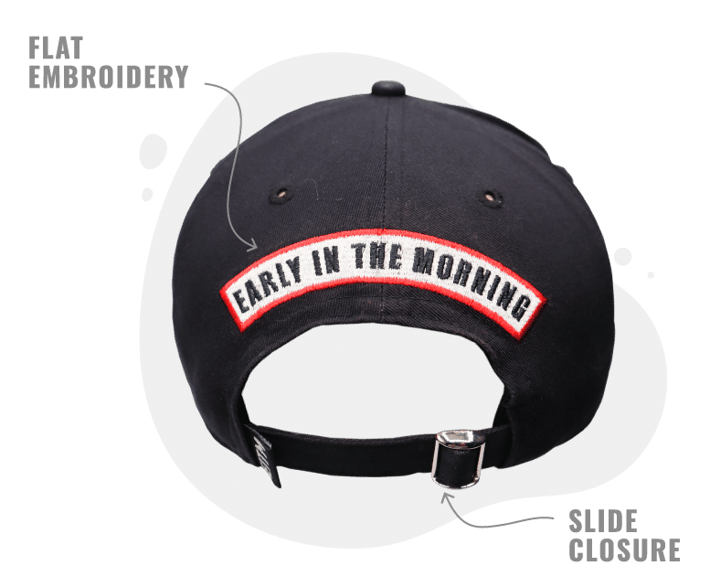 Sur le panneau avant on retrouve un patch brodé avec un fond en coton et des broderies mix (3D et plates). À l’arrière, le patch brodé est parfaitement adapté à la courbe de l’ouverture. Généralement selon votre demande nous adaptons toujours votre design à la casquette.